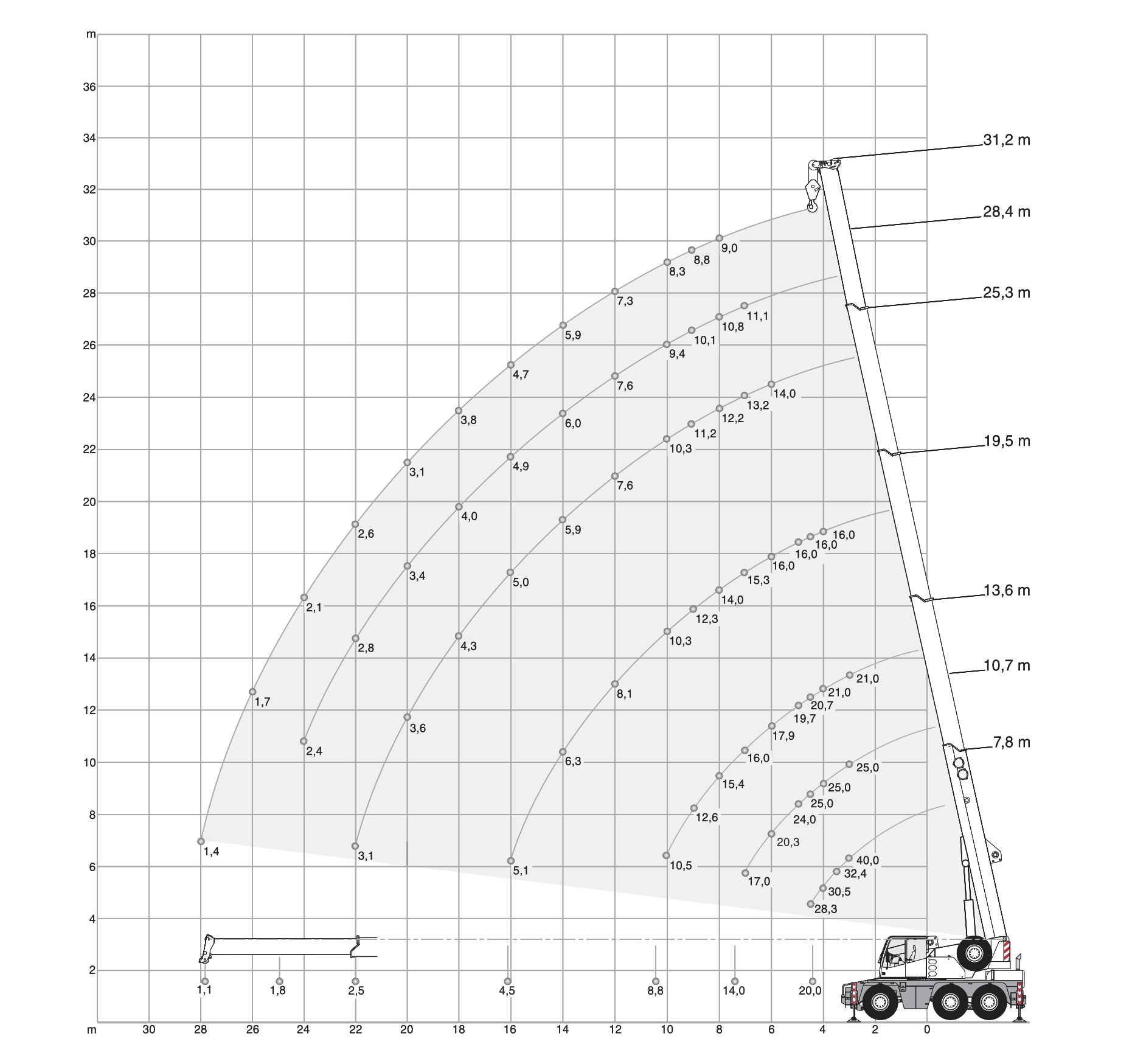 max. vyložení: 28,0 m (1 400 kg)
